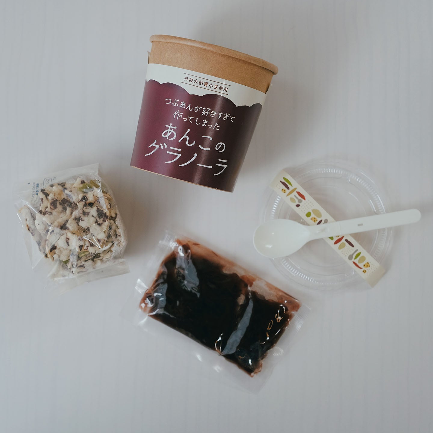 グラノーラは、主原料は、小豆。小麦粉や油、砂糖は一切使っていません。ポン菓子のように膨らました小豆に、ビタミンやミネラルたっぷりなシードやドライフルーツが入っています。ほんのり感じる塩味がつぶあんとの相性◎。