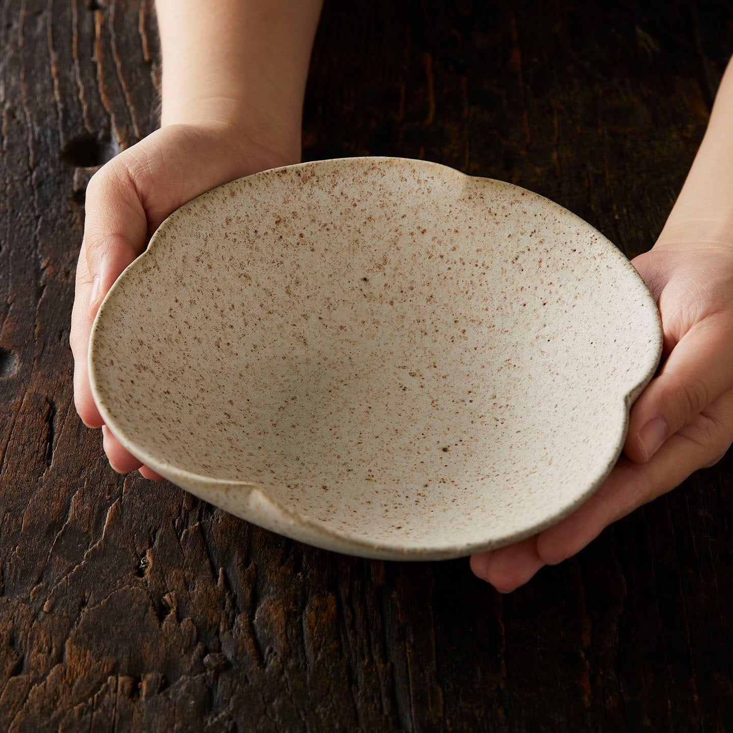 ヒラヒラしていてかわいいお皿だなーと思い、購入しました。目跡「あり」と「なし」があると商品説明に書かれてあり、どっちが来るだろうー?と楽しみにしていましたが、目跡あり!個人的に目跡が大好きなもので嬉しかったです。そして、このヒラヒラがなんとも美しく、想像以上にかわいかった。お気に入りです。