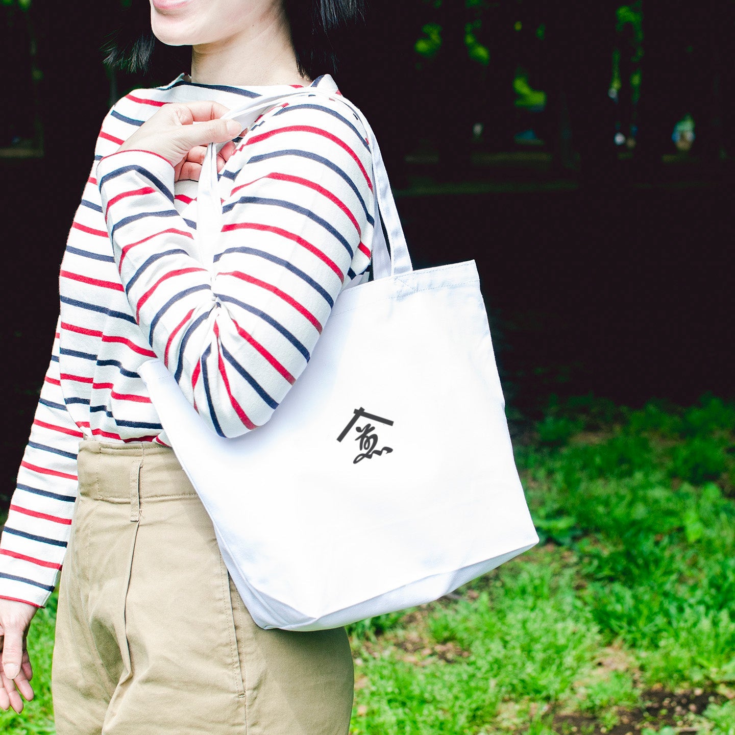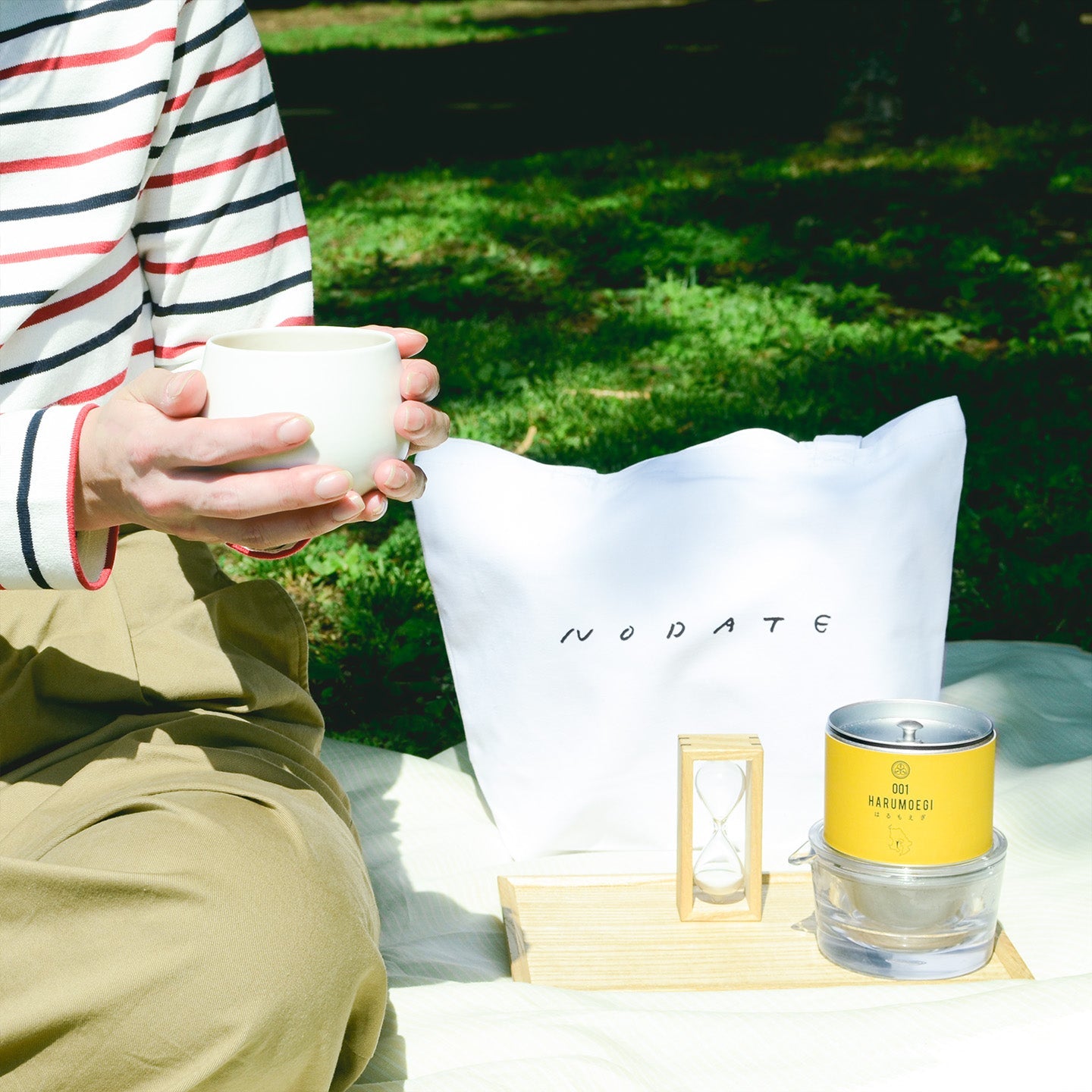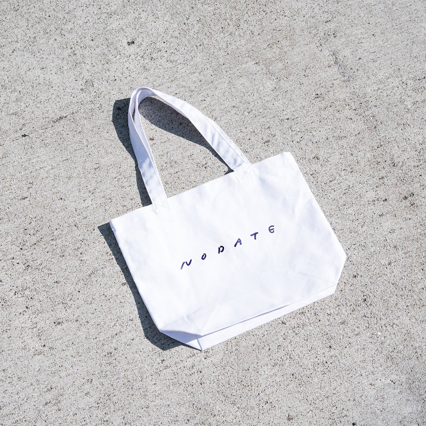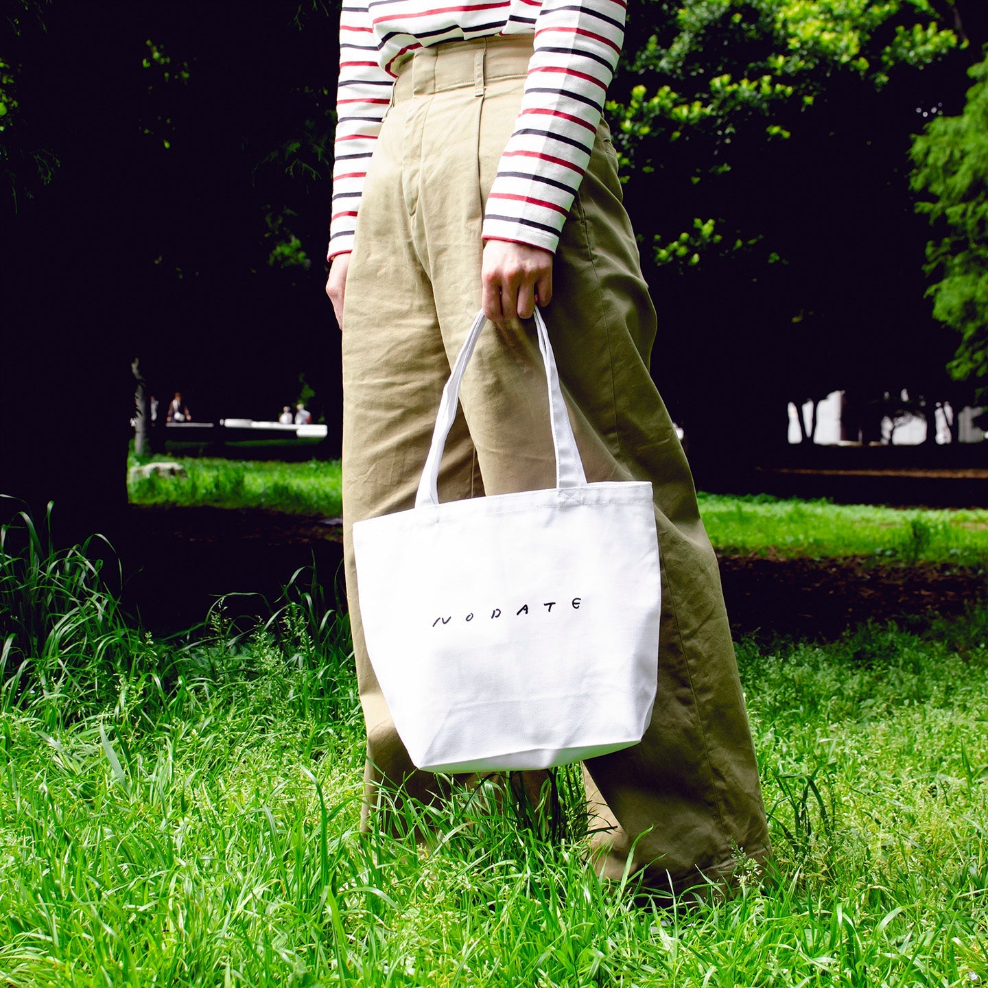 表面には煎茶堂東京のロゴを、裏面には「nodate(野点)」の文字が入っています。ホワイトのキャンバス生地で、厚みは一般的で薄くもなく、分厚くもなく。気負わずに使えるトートです。